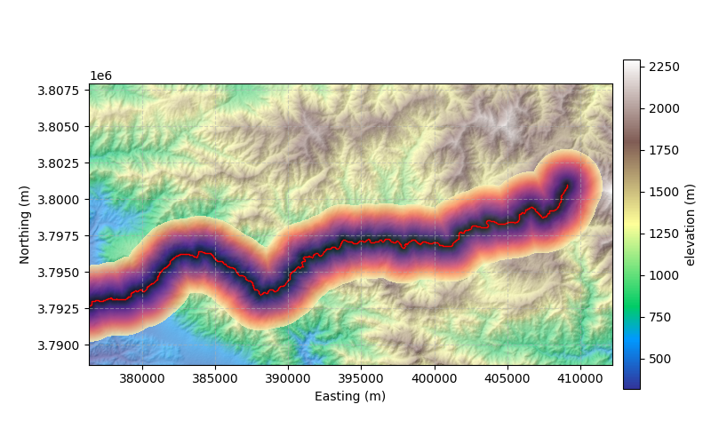 distance_map = ttb.compute_swath_distance_map(dem, Dmap.centre_line_x, Dmap.centre_line_y, half_width=half_width, input_mode="coordinates")