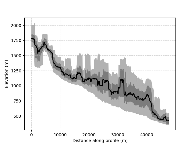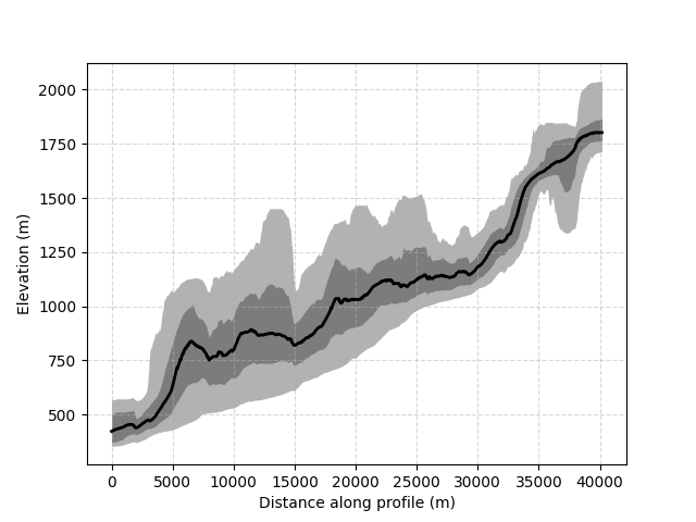 Swath profile allows the analysis of areas neighbouring a baseline. It can be useful for following relief evolution — or any other raster-like metrics in space around a given line.