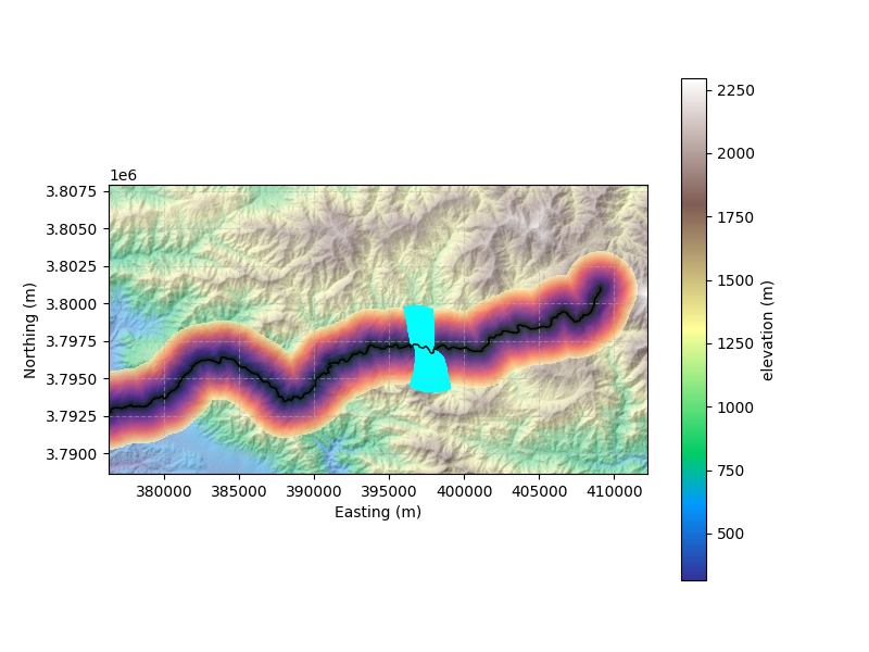 xriv,yriv = nodes = ttb.transform_coords(dem, stream.source_indices[0], stream.source_indices[1], input_mode="indices2D", output_mode="coordinates")