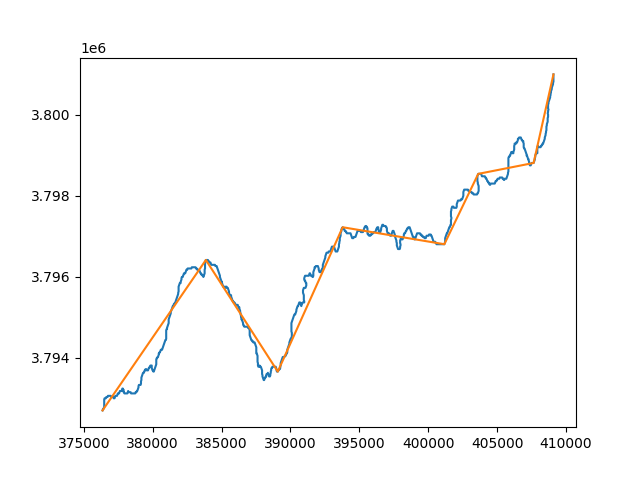 sx,sy = ttb.simplify_line(dem, xriv,yriv, tolerance = 10, method = 3, input_mode= "coordinates")