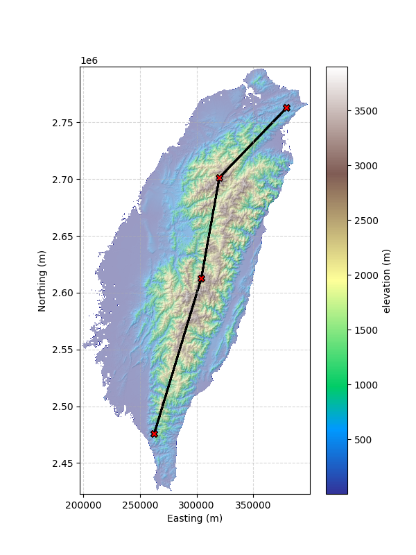 sampled_x, sampled_y = ttb.sample_points_between_refs(dem, ref_x, ref_y, input_mode="coordinates")