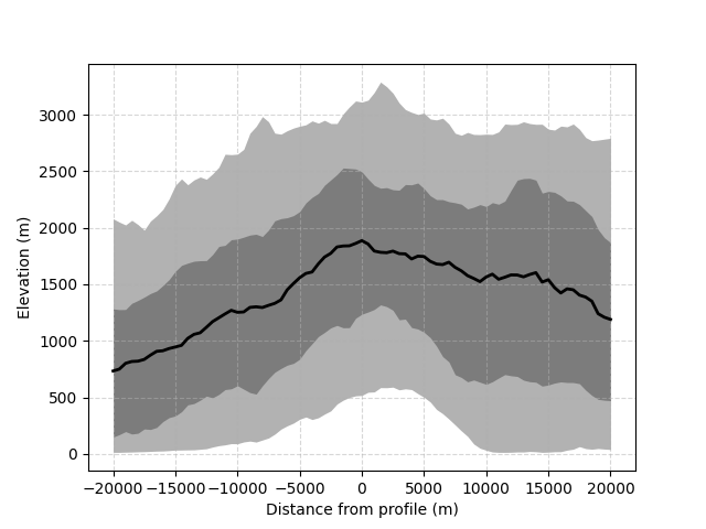 t_swath = ttb.transverse_swath(dem, distance_map, half_width, bin_resolution = 500, percentiles=[5,10,20,80,90,95])